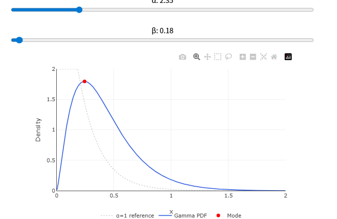 \(\alpha\) は分布の形(小さいと裾が重い・尖った形、大きいと山に近い)、\(\beta\) は尺度(単位)の役割を持ちます。図を動かしてみてください。